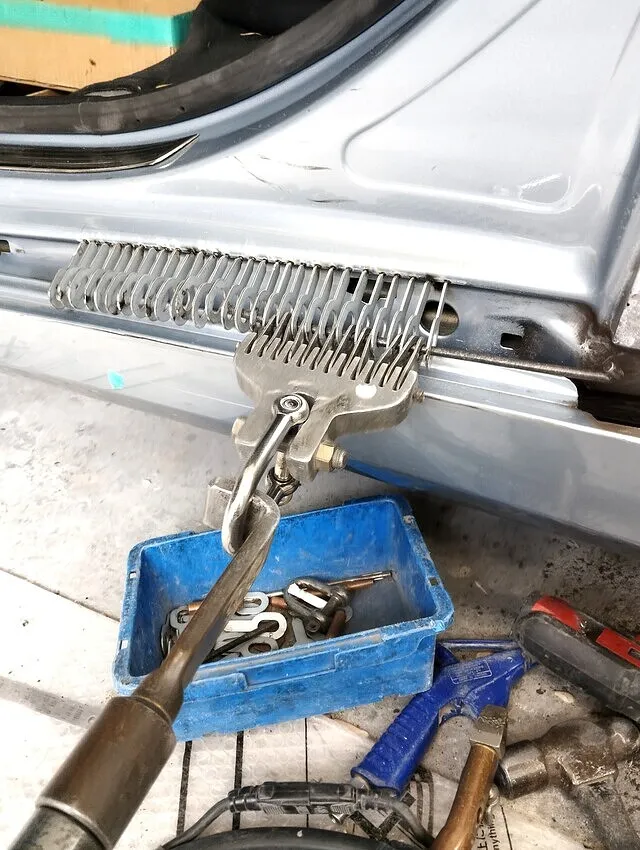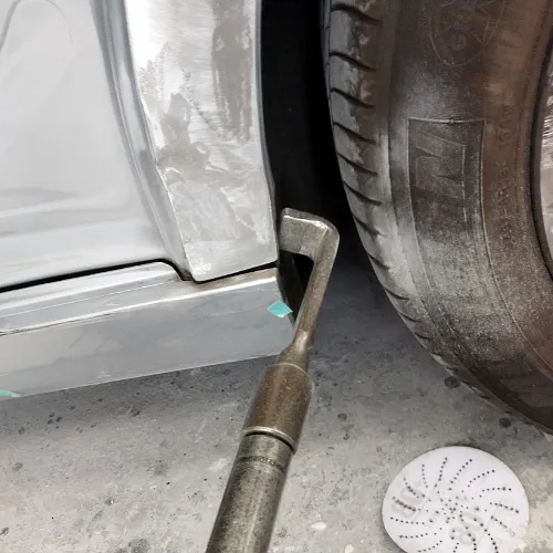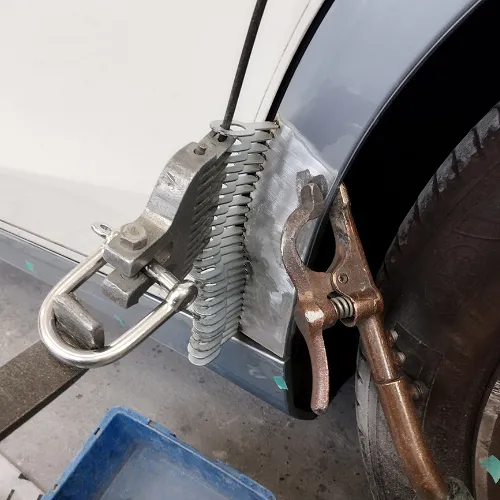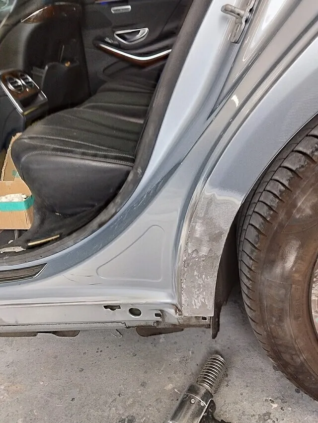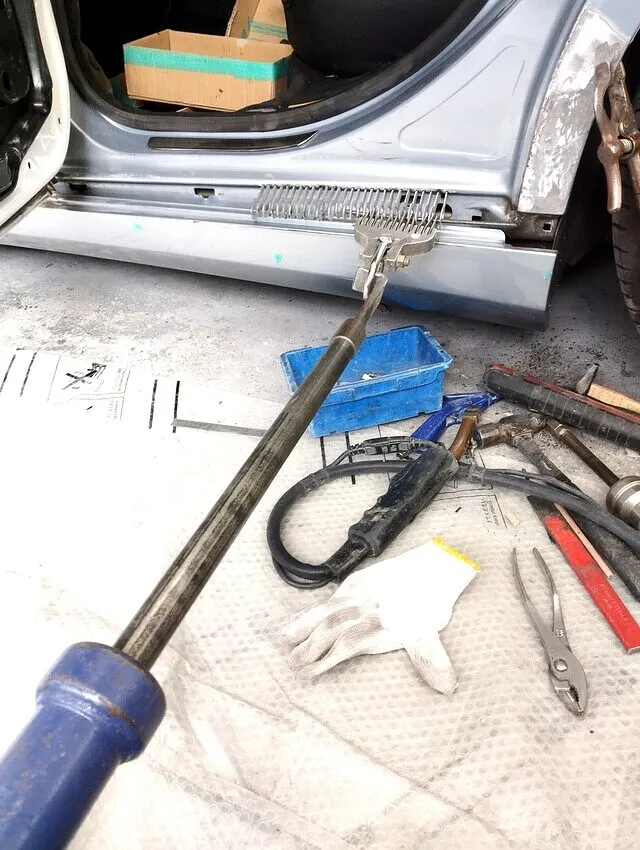 ベンツSクラスの左サイドシルと左リヤフェンダー部の板金修理は非常に難易度が高く、特にアルミ素材の場合は硬く、変形が激しいため、一般的には新品交換が推奨されます。当店では専用工具の「スタッド溶接機(スタッド溶接機)」や「スライドハンマー」を駆使し、パネルの引き出し作業を丁寧に行います。