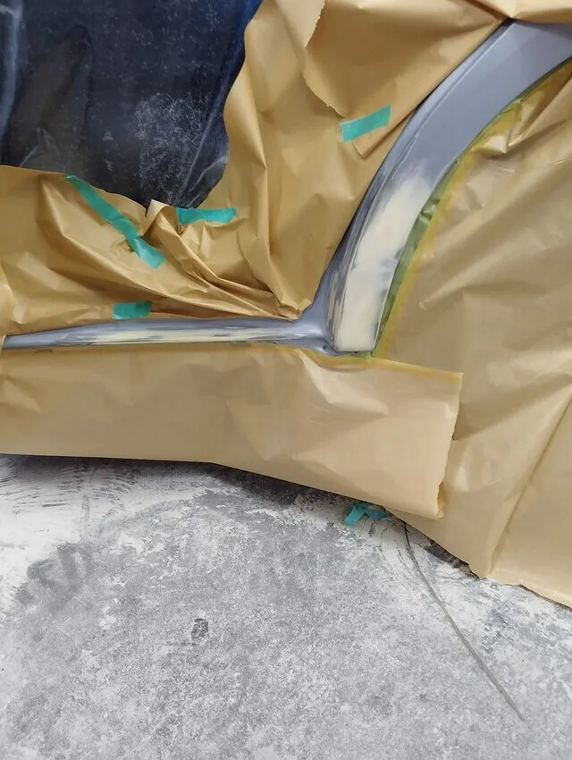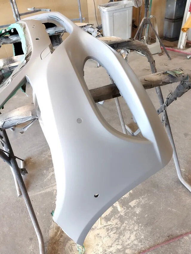 次のパテ工程では、表面の微細な凹凸を完全に平滑化するため、丁寧なパテ処理を施します。パテを極薄で均一に仕上げることで、塗装後の美しさと耐久性を確保します。続くサフェーサー工程では、塗装下地として最高品質のサフェーサーを均一に吹き付けます。この工程が塗装の仕上がりを左右するため、細部まで慎重に作業します。これら一連の工程は手間を惜しまず、精密さを追求。仕上がりの美しさはもちろん、耐久性や品質にも自信があります。安心して愛車をお任せください。