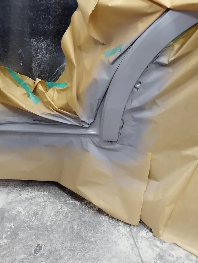 引き出し後のパテ工程では、表面の微細な凹凸をなくすために、薄く均一にパテを塗布。左リヤドアとの面合わせ(チリ合わせ)やバランスを専門技術で徹底調整します。次のサフェーサー工程では、塗装下地として耐久性に優れたサフェーサーを均一に吹き付けます。パネルの平滑性を追求し、最終的な仕上がりの美しさを左右する重要な工程として、職人が細心の注意を払い仕上げます。