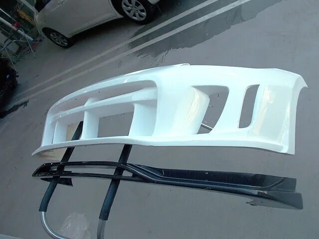 社外オーダーのフロントエアロ(FRP製)は、巣穴(ピンホール)や表面の凹凸が多く、どうしても加工の手間がかかりがちです。しかし当社では、“とりあえず塗って形になればいい”という妥協は一切いたしません。仮付け(仮合わせ)を徹底して行い、ボディとのクリアランスやラインを細かく確認しながら、建付けの調整を施します。こうすることで、後から無理に穴位置を変えたり削ったりせず、愛車との一体感ある装着が可能になるのです。