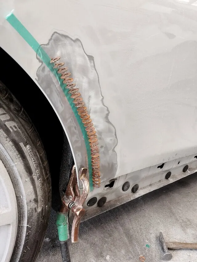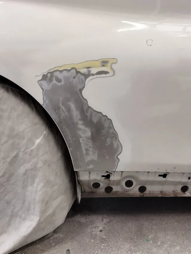 右クオーターパネルの板金とサイドシルガーニッシュの下地処理は、車のサイドビューを“決定づける”重要な工程です。まずは大きく変形したパネルを少しずつ叩き出し、金属の弾性を活かして元のラインへ引き戻します。ここで妥協してパテを厚盛りしてしまうと、後から収縮やひび割れを起こしたり、光の角度で“波”が見えてしまう原因に。だからこそ、当社では繊細なハンマーリングと“最小限のパテ”を理想的に組み合わせ、純正フォルムに近い美しいカーブを再生することを徹底しているのです。