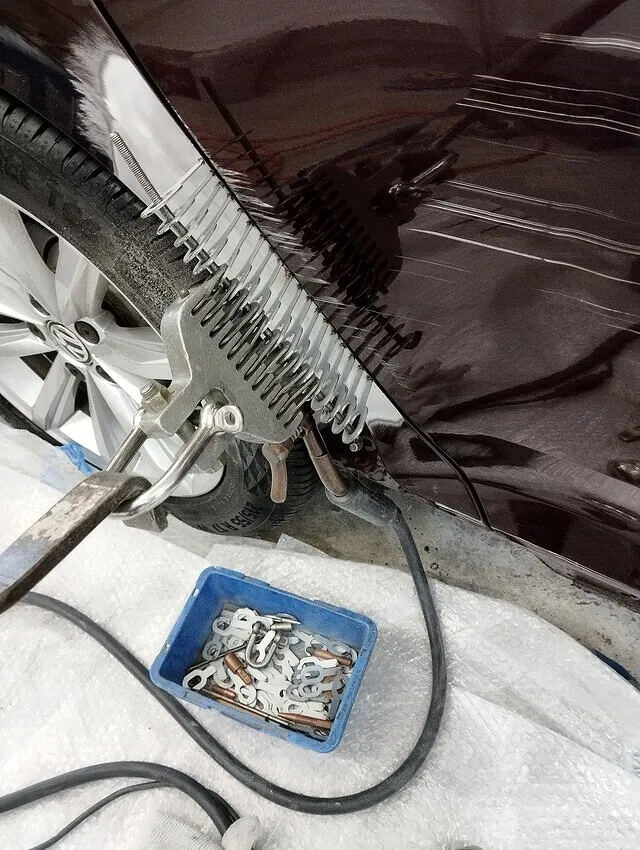 ●1枚目:凹み形状確認+スタッドセットアップ中|波状の引き出し損傷