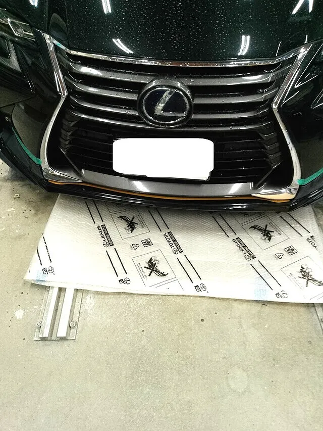 ● 写真は、レクサスGS450h(GWL10)のフロントバンパーに装着されていたモデリスタ製リップスポイラー脱着作業中の状態。