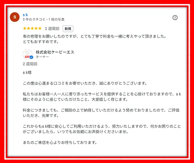 お車の修理という、大切なお悩みに真摯に向き合った結果、s k様にご安心いただけたことが、私たちにとって何よりの喜びです。