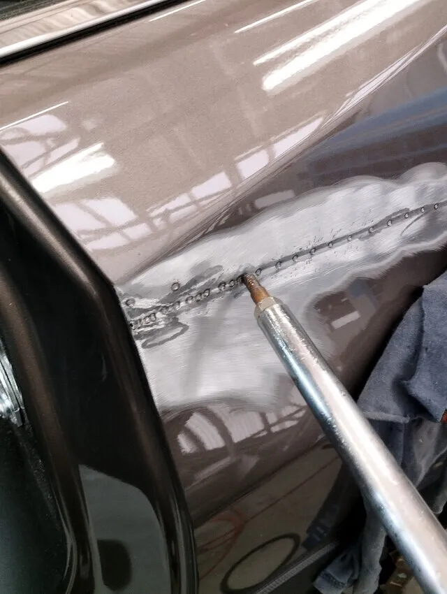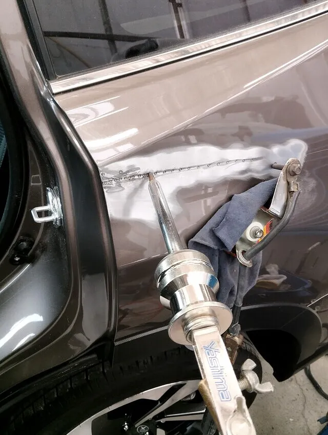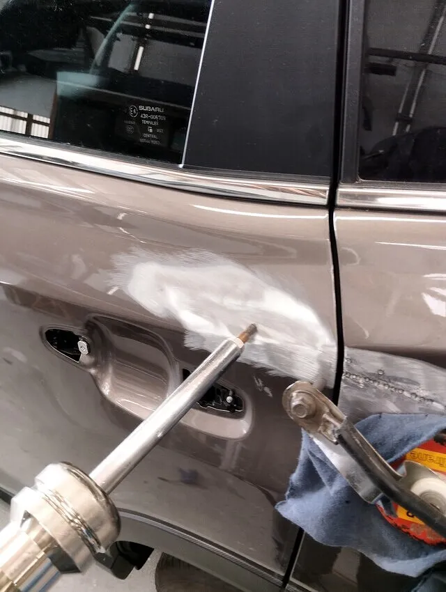 ●写真では、点溶接+スライドハンマー併用によるリペア過程を記録。