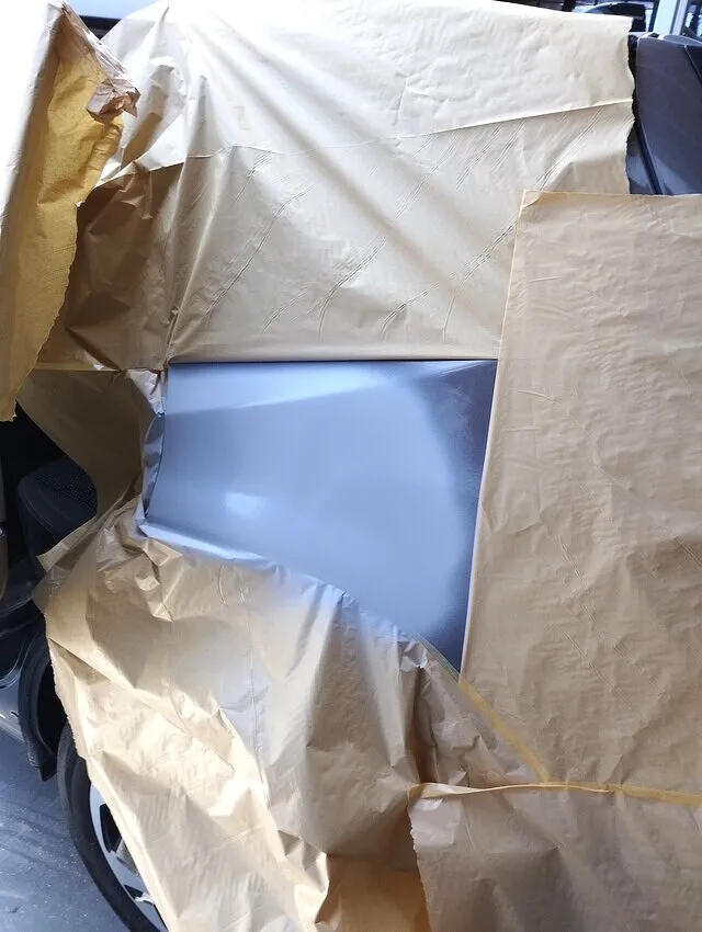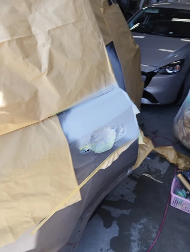 ●その後、2コートパール耐スリ傷仕様に対応したグレー系サフェーサーを吹き付け。広範囲への処理により、塗装時の色ムラや境目が出ないよう丁寧にマスキング&均しを行いました。