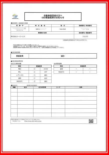 ●診断結果は「適合」として正式に発行済。バッテリー電圧・MILランプ・保安系統も含め、整備記録としてお客様にお渡ししています。