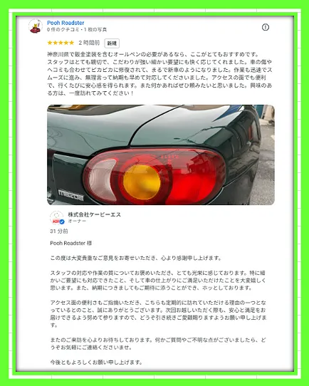 このたびは大切なお車をお預けいただき、また心のこもった素敵なレビューを本当にありがとうございます。
