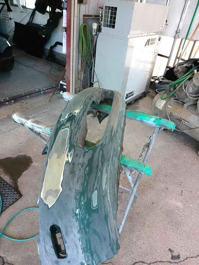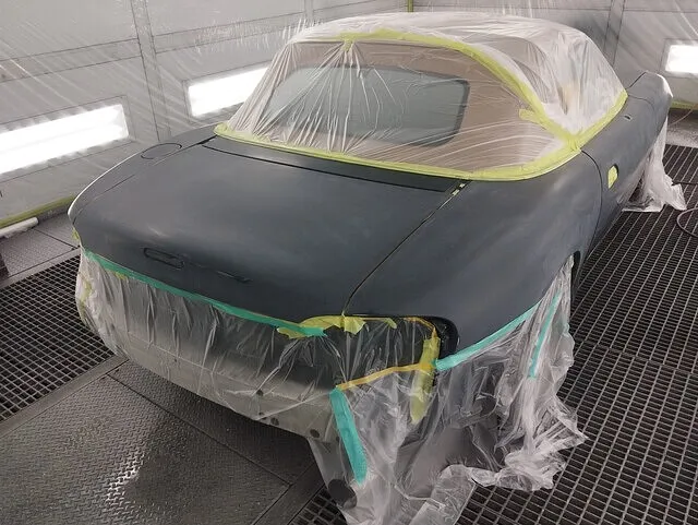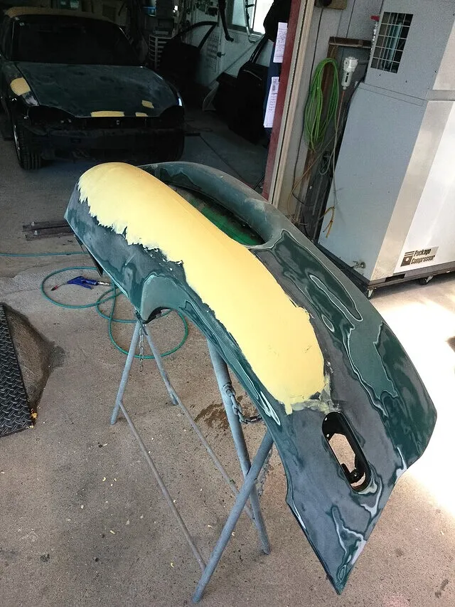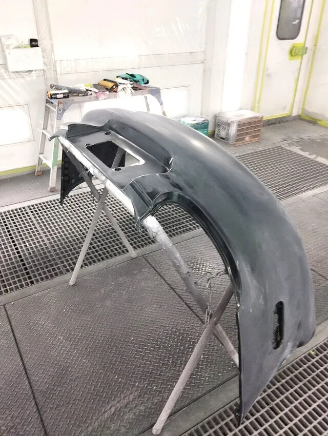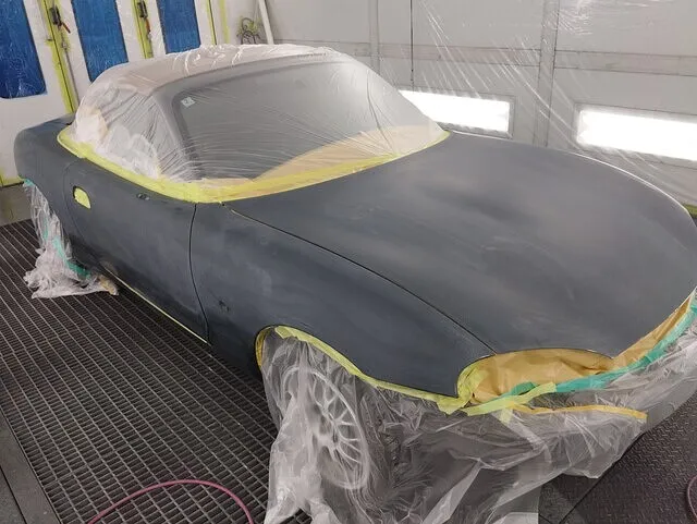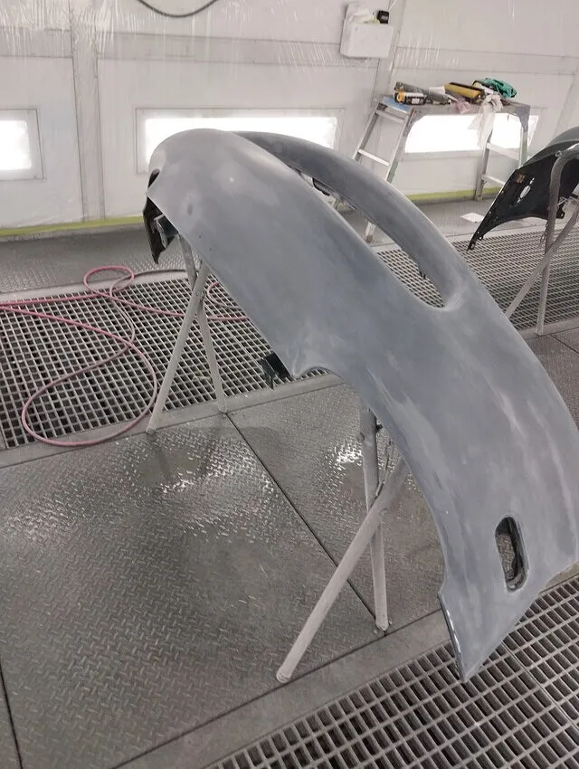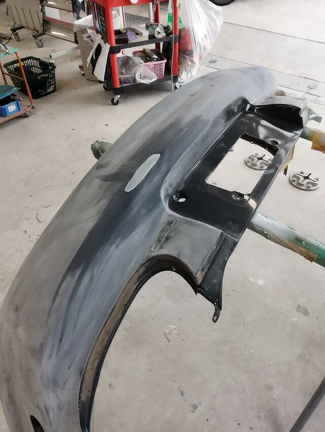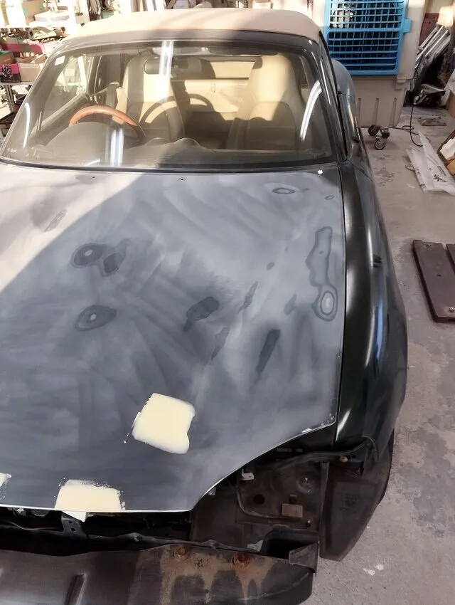 この段階では、フロントバンパー・リアバンパー・ボディ全パネルすべてにサフェーサーを施工済み。