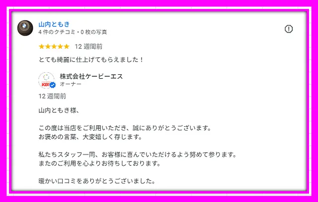 「とても綺麗に仕上げてもらえた」とのご感想を拝見し、スタッフ一同とても嬉しく思っております。