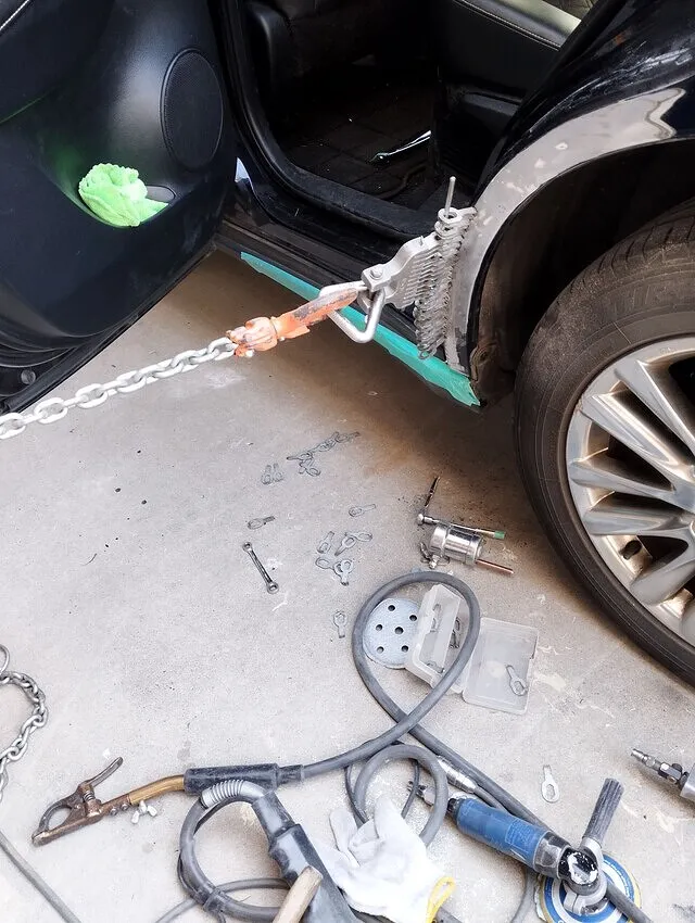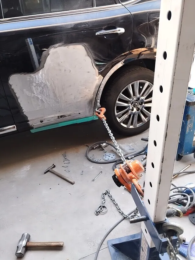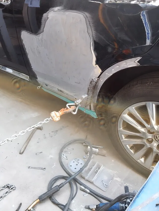 この写真は、リアクォーター部の鉄板をチェーンで正確に引き出している最中の迫力シーン。
