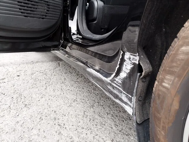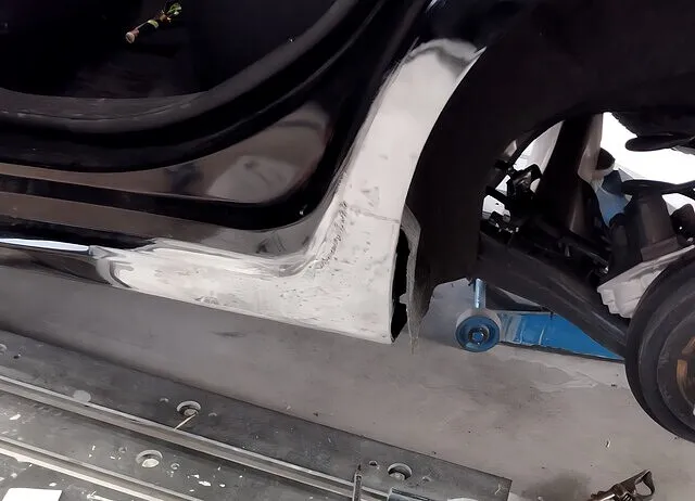 こちらは、左アウターシルとリアフェンダー下部の損傷を、交換せず板金修理で対応した事例。
