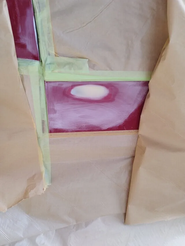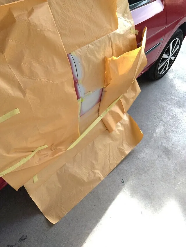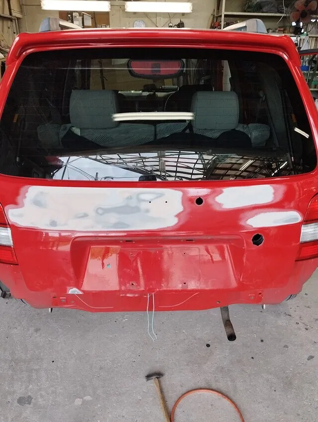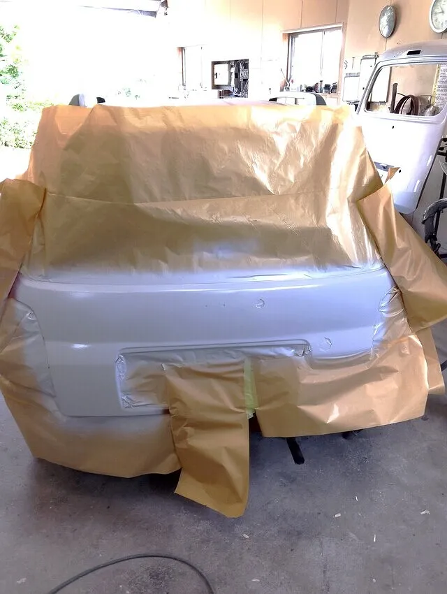 色ムラ・透け・ひび割れを防ぐため、リアゲート全体を包み込むように下地処理。
