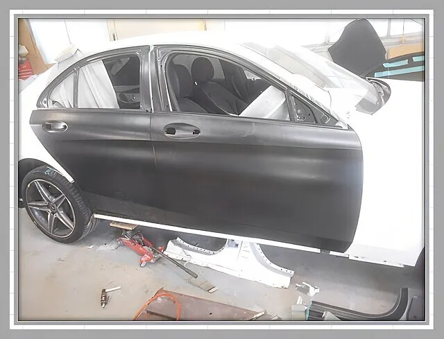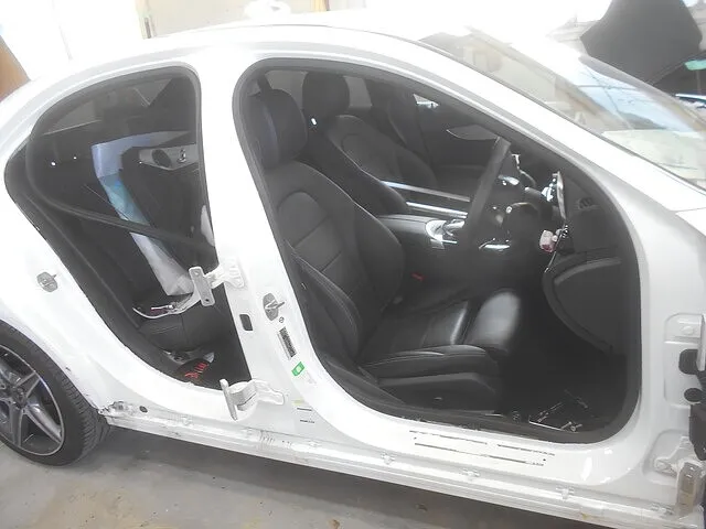 今回のご依頼は、ベンツCクラス右側面の大きな損傷。フロントドア・リアドア・センターピラーをすべて交換する必要がありました。