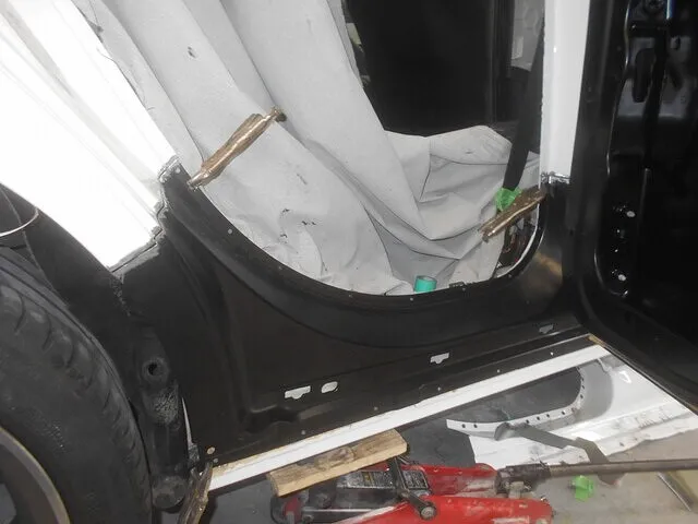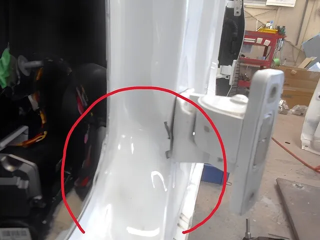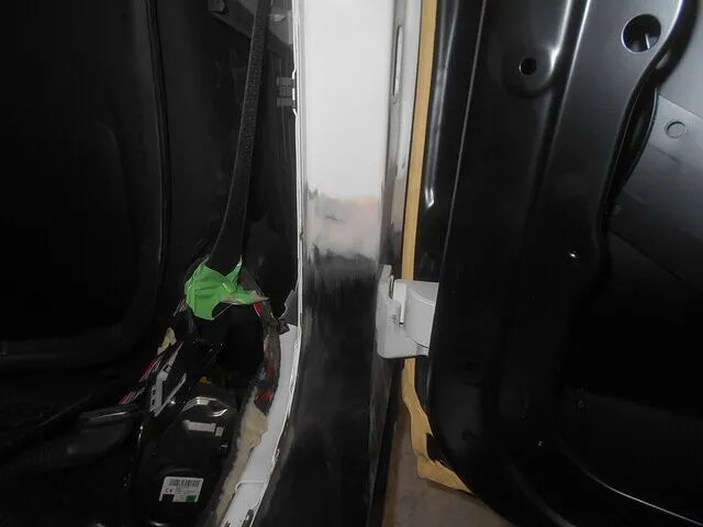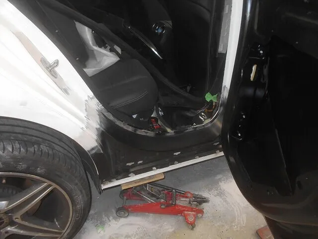 写真のとおり、センターピラーに大きなシワが入っている状態でした。車体の骨格にあたる部分なので、ここまで損傷してしまうと「板金修理」では対応できず、交換が必要不可欠です。 センターピラーはボディ剛性や安全性に直結するため、施工の精度が仕上がりを左右します。KBSでは、メーカー基準に沿った溶接ピッチや補強工程、防錆処理まで正規通りに実施。交換前のこのシワも、すべて新しいパネルに入れ替えて強度と見た目を復元していきます。