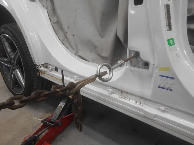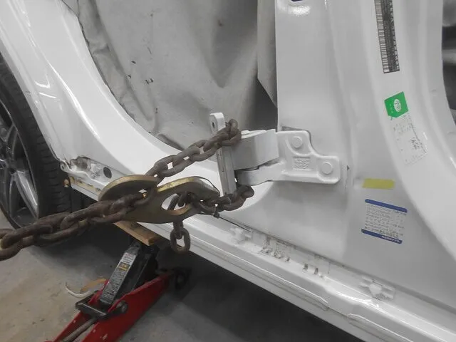 大きくシワが入って変形したセンターピラーは、そのまま切り取ってしまうのではなく、まず専用治具で引っ張り出しながら荒出しを行います。これにより、ボディ全体の芯や周辺パネルの位置関係を正しく整えてから交換に入ることができます。