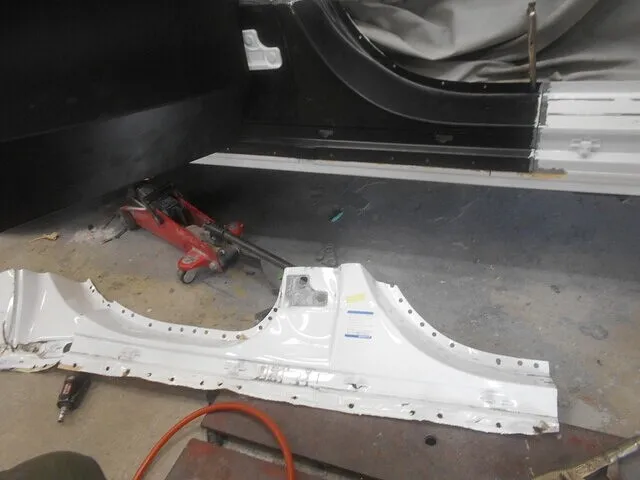 写真は、損傷部を切り取り、新品パネルを正規の接合ポイントで組み込んだ状態です。交換ラインがしっかり見えることで、「確かに新品に入れ替えた」という証拠にもなります。 KBSではディーラー同様に、メーカー指定のスポット溶接ピッチや補強部位を守って施工。単に外見を直すだけでなく、車体の剛性や安全性を損なわないことを最優先にしています。 この工程写真を見れば分かる通り、“正規手順で新品交換を行っている”ことが一目で伝わる仕上がりです。安心して任せていただける理由がここにあります。