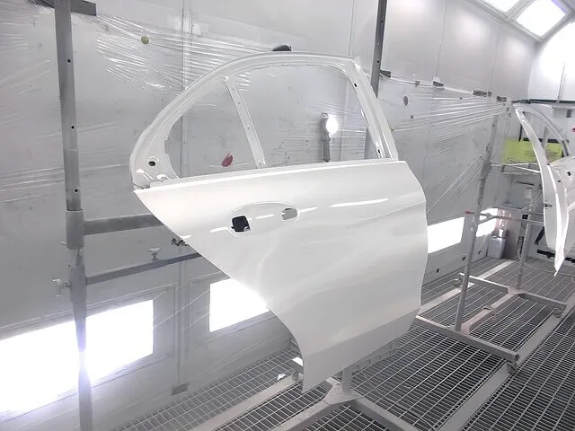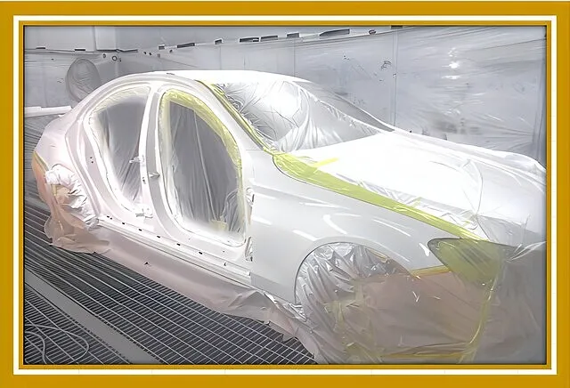 この写真は、専用の塗装ブースで全体をマスキングし、アクサルタ塗料で丁寧に吹き付けている工程。大きなボディに均一な艶が広がる様子は、まさに“新車時の美しさ”を取り戻す瞬間です。