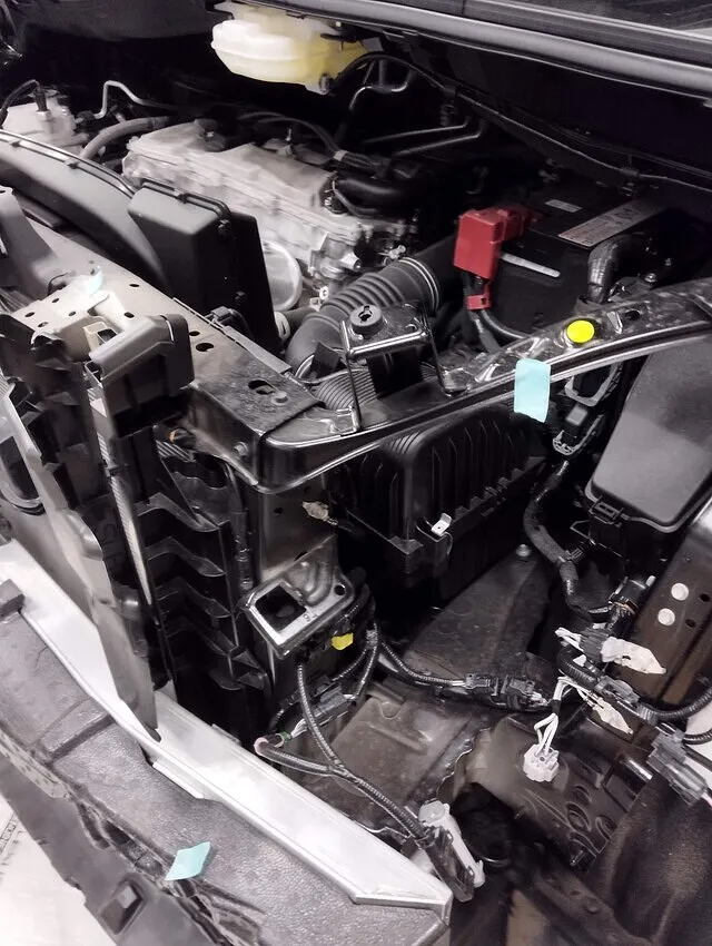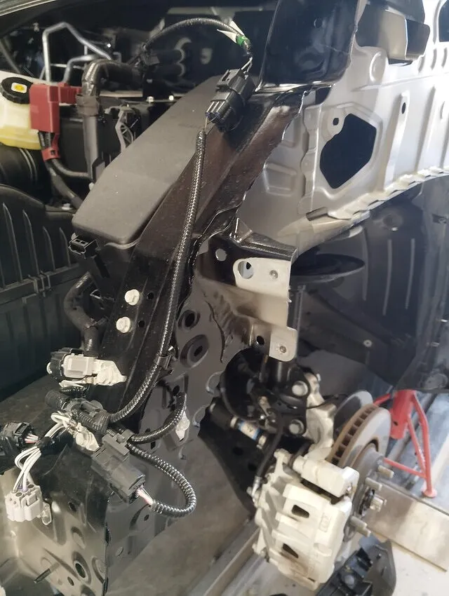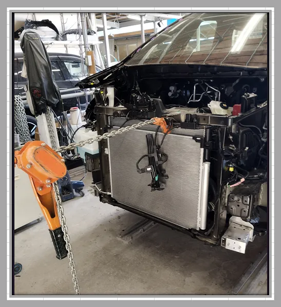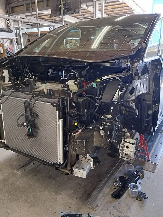 外装を外して内部を確認すると、ラジエーターサポート周りや左側クロスメンバーに大きな歪みが出ていました。骨格部分は車体全体の剛性や安全性に直結するため、表からは見えない部分でも絶対に妥協できません。