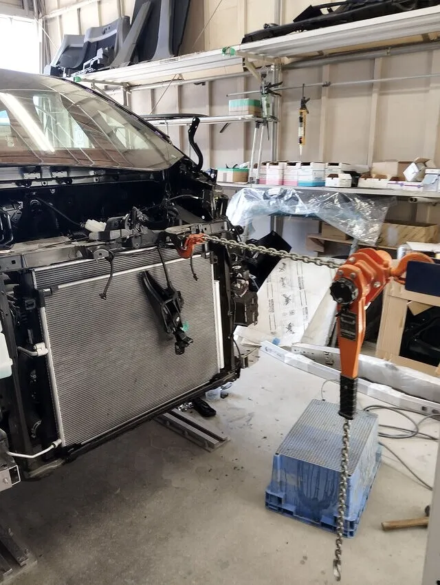 写真は、フロント骨格をチェーンで引き出しながら修正しているシーンです。大破修理の工程の中でも、もっとも迫力のある場面ですが、ここで大切なのは力強さだけではありません。