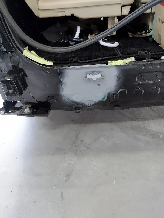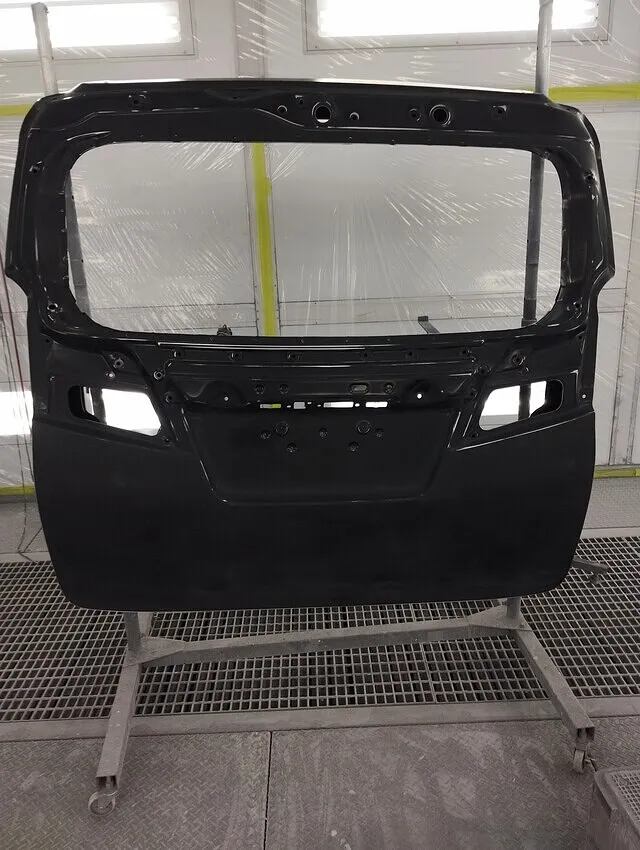 写真は、カラーコード202(ブラック)を耐スリ傷クリアで仕上げた新品リアゲート塗装の完成シーン。