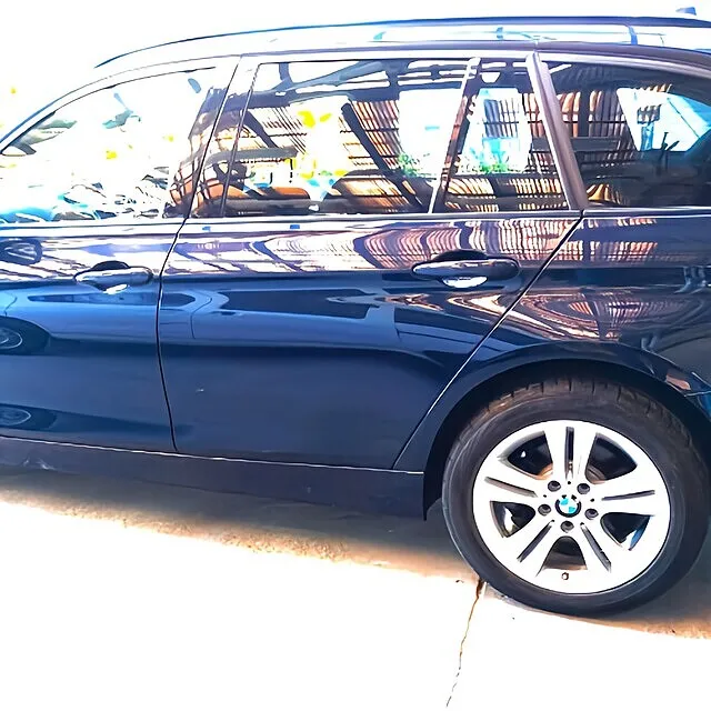 熟練技術者による自社一貫体制で中間マージンを排除し、最新設備+高品質塗装により、BMW 3シリーズツーリング(F31/DBA-8E15)の左リヤドア~クオーターの難修理も迅速かつ低コストで対応しました。