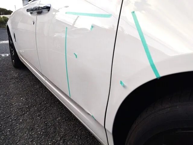 今回は、左リヤドアからリヤクオーターにかけてのパネルに擦りキズとへこみが発生したため、