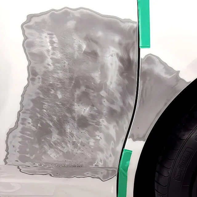 リヤドアはスチールパネル特有の張りを活かし、叩き出しと均し作業で元の形状を復元リヤクオーターのラインも自然に繋がるよう、最小限のパテ整形+面出しで整形下地処理から塗装仕上げまで一貫施工し、色味・艶感ともに自然な仕上がりを実現ロールスロイスのような高級車でも、すべてを交換せずに直せる可能性はあります。