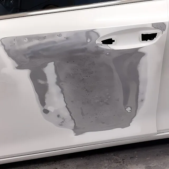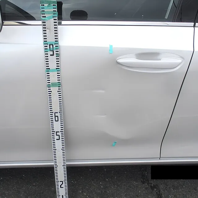 今回の損傷は、ドア中央に深い押し込みと上下のパネル歪みが混在する状態。