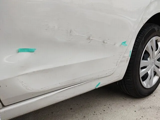 今回は、ホンダ・フィットの左リヤドアとサイドステップに広がるキズ・へこみ修理事例をご紹介します。