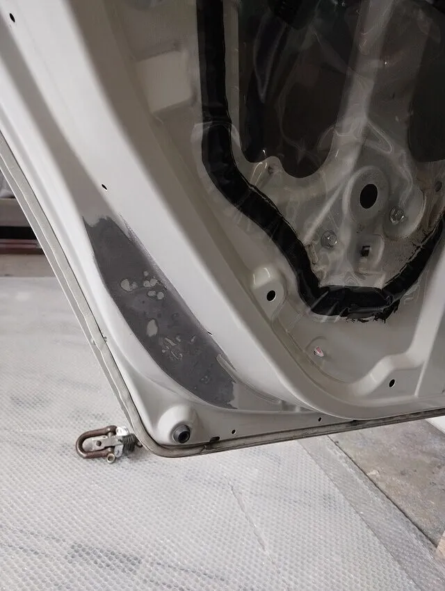 こちらは、左リヤドアの下部インナー(裏側)部分の板金修正工程です。