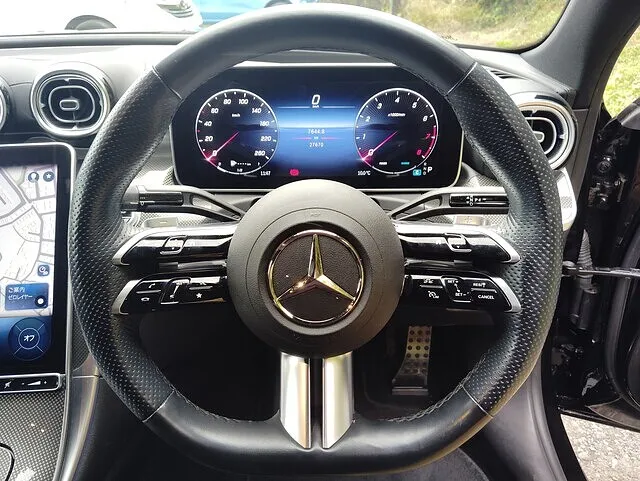 横浜市都筑区の勝田レンタカーでは、現行メルセデス・ベンツCクラス アバンギャルドの上質な内装をそのまま“代車”として体験できます。写真の通り、12.3インチのフルデジタルメーターは視認性が高く、最新のUIで走行情報を直感的に確認可能。センターには大型縦型ディスプレイを配置し、360°アラウンドビューモニター・バックカメラ・パーキングアシストなど、駐車支援機能もフル装備。ステアリングは高級レザーで仕立てられ、タッチコントロールや先進のドライブモード切替にも対応。さらにアンビエントライトや静粛性の高いキャビン設計により、輸入車ならではの上質な空間を実現しています。修理期間中でも妥協したくないお客様に、勝田レンタカーは“上位グレード専門”として最適な1台をご提供します。