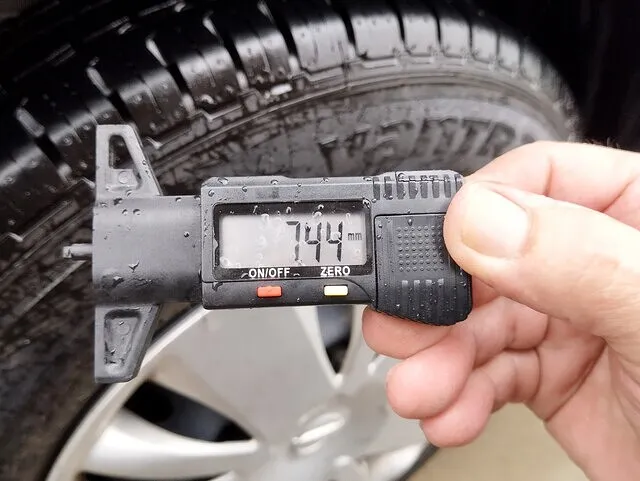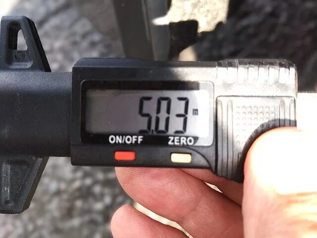 今回の点検では、デプスゲージを用いてタイヤ溝を測定したところ、残溝が5mmあることが確認されました。一般的に1.6mm以下になると法的に使用不能となり、3mmを下回るとウェット路面や緊急制動時のグリップ力が大きく低下するため、5mmあればまだ十分な安全マージンが保たれています。しかし、走行距離や路面状況に応じて摩耗は進行しますので、定期的にデプスゲージによるチェックを行い、交換時期を見極めることが重要です。