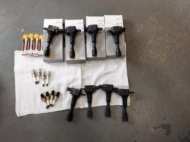 点検の結果、イグニッションコイルの劣化とスパークプラグの消耗が主な原因と判明しました。