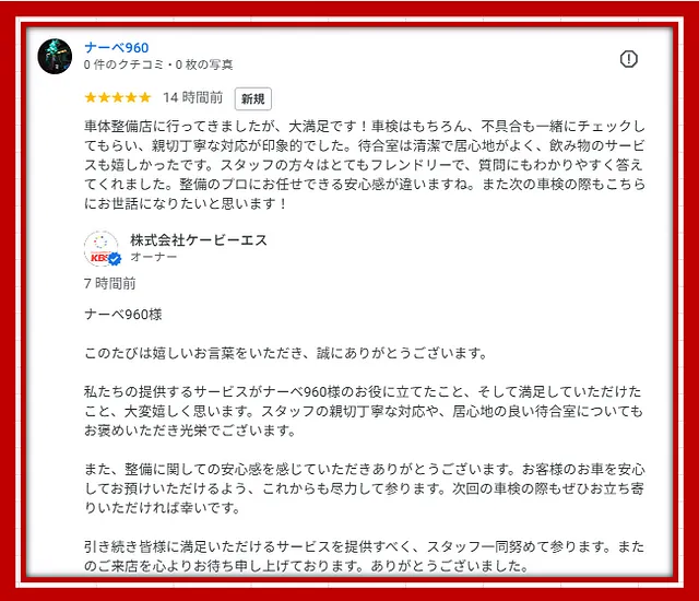 整備内容はすべて「見える化」+プロの説明付きで、安心して任せられる車検整備に。Googleクチコミでも「大満足」「またお願いしたい」とのお声をいただいた、品質と信頼を形にした実例です。