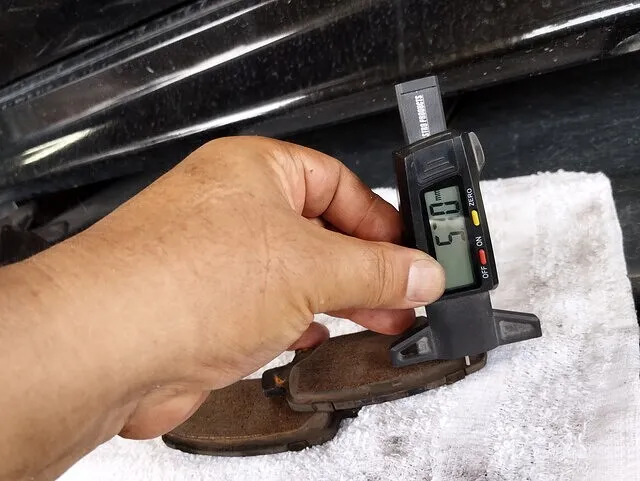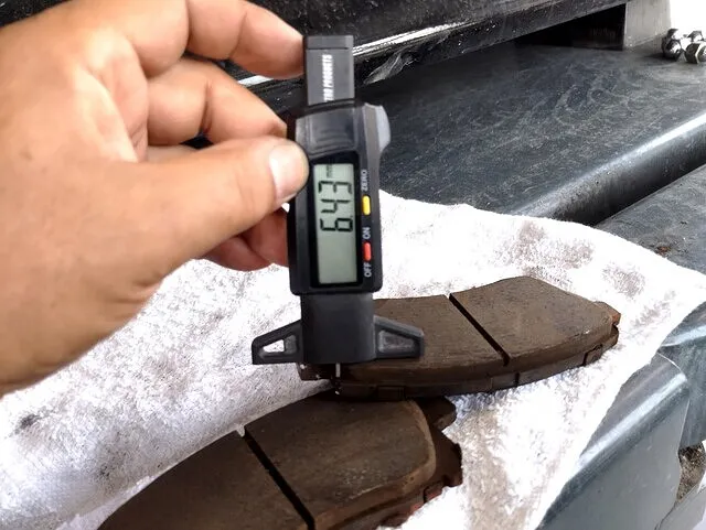 今回お預かりした**横浜市都筑区のスバル・レガシィB4(BE5)**では、フロント6.5mm・リア5.5mmのブレーキパッド残量を専用工具で計測。