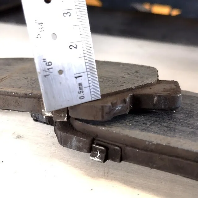 タイヤを外し、パッドを取り出したうえで定規を使ってミリ単位で正確に計測。前後ともに残量が規定値を下回っていたため、安全を第一に考え前後ブレーキパッドを交換いたしました。