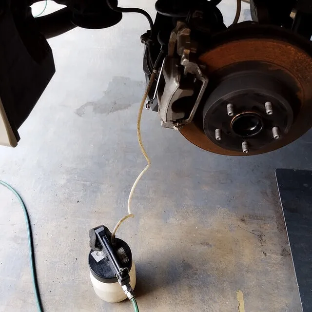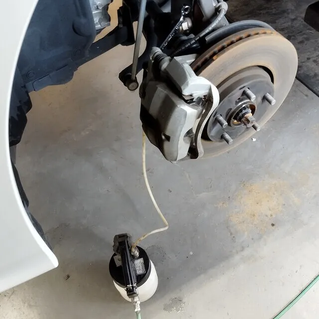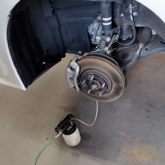 さらに、ブレーキフルードの交換では、専用の機材で一輪ずつ丁寧に圧送・エア抜き作業を実施。